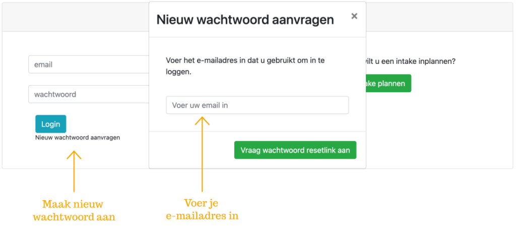 If you want to make an appointment with us, first click on ‘request new password’. Then enter the email address you have registered with us and create a password. You will receive a confirmation email, after which you will be able to log into the system to schedule an appointment.